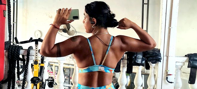 Onlyfans model showcasing a vibrant swimwear set with a confident, poised pose. She is at a gym setting.