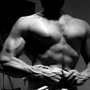 A professional OnlyFans model showcasing his physique. The image features a man from behind, flexing his muscles, with visible abs and a well-defined back. He is standing in front of a mirror wearing a towel, which is draped over his shoulder. His body language suggests confidence and fitness. This type of photo is commonly associated with male fitness models.