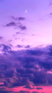 This image captures the breathtaking view of a lavender sky at sunset, with dark clouds looming over a peaceful landscape. The deep purple hues of the sky contrast beautifully with the warm orange tones of the setting sun. A full moon can be seen in the upper right corner, adding to the serene and tranquil atmosphere.