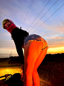 Meet Dabbyjul, a bikini model from Miami, Florida. She's captured the attention of her fans with her adventurous spirit and outdoor activities. In this image, she's wearing a red bikini, posing by a motorcycle parked near a street light at dusk. She's facing away from the camera, giving us a tantalizing view of her backside. Her outfit is casual yet stylish, perfect for an evening ride. The background is bathed in warm hues of orange and pink, suggesting it's sunset. Dabbyjul's pose and the overall mood of the image suggest a sense of freedom and exploration. She's not just a model; she's an adventurer enjoying her life outdoors.