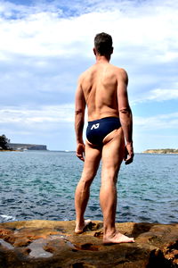 A young, shirtless man stands confidently on a rocky beach, flaunting his underwear in an orange and white swimsuit. With his toned abs and chiseled chest on display, he adds an adventurous vibe to his OnlyFans persona.