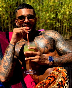 The image depicts a young, muscular man, approximately 27 years old, with a striking presence. His wide chest, prominently defined muscles, and the visible veins on his arms indicate a commitment to bodybuilding. The man's skin is adorned with intricate tattoos, contributing to an overall rugged look. His face is captured in detail, highlighting his manly beard which adds to his charismatic persona. The man is bare-chested, revealing his well-sculpted physique. His wrist appears strong, suggesting a level of physical fitness. He is indoors, possibly in a personal space or a gym, against a nondescript wall which puts the focus entirely on him. The lighting in the image seems to be accentuating the man's muscular contours, casting a play of light and shadow that emphasizes his physical strength. Overall, the image portrays a compelling blend of masculinity, strength, and personal style, embodied in a young man dedicated to physical fitness and self-expression through body art.