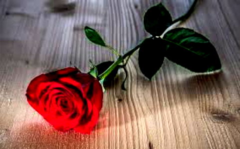 A solitary red rose rests on a wooden surface, its vivid color contrasting with the natural grain of the wood. The image is soft-focus, adding a sense of tranquility and timeless beauty to the scene.