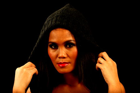 A professional model portrait. Wearing a black lace bra, matching black choker necklace and earrings, with bold red lips.