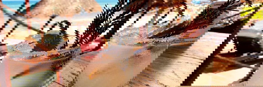 Enjoy a refreshing drink on a beautiful beach. The clear blue skies and ocean breeze create the perfect setting for relaxation. In this image, two mojito cocktails are beautifully presented on a wooden table with palm umbrellas in the background. These drinks, garnished with mint and lime, are perfect for sipping while watching the waves come in. Cheers to a relaxing beach getaway!