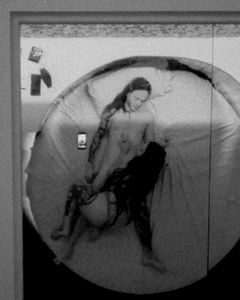 This is an artistic and intimate photo of a model in a compromising position, likely evoking emotions related to the concept of freedom or breaking out of traditional societal norms. The model's pose suggests a sense of surrender or release from constraints.