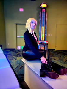 A cosplayer model with a distinct style, capturing the essence of her character. She is in the midst of an expressive pose, showcasing her flair for costume play.