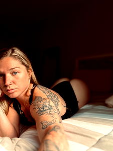 This image features a model posing for an OnlyFans photoshoot. The model is lying on the bed with their hand placed under their head, creating a relaxed and sensual atmosphere. They are wearing a lingerie set that accentuates their physique, while their tattoos add to their unique style. The lighting in the room enhances the mood of the image, casting soft shadows and giving the scene an intimate feel.