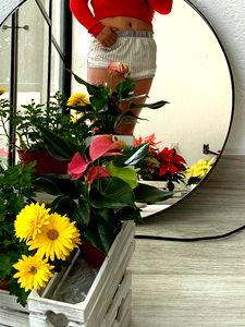 In this charming scene, we see a model with vibrant red hair captured in front of her floral-themed potted plants. She sports a cozy white sweater paired with blue jeans and stands by a mirror, showcasing the sunny ambiance of her home gardening corner.