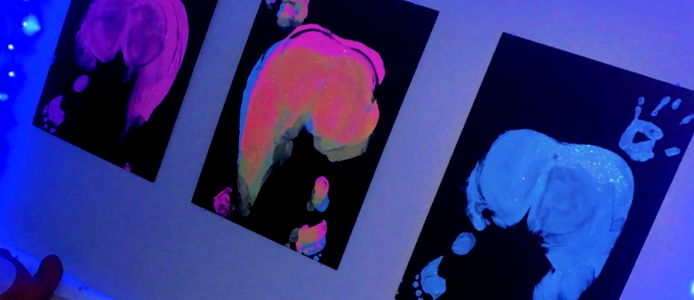 OnlyFans model, adult content, colorful poster with handprints and a sloth, social media promotional material.
