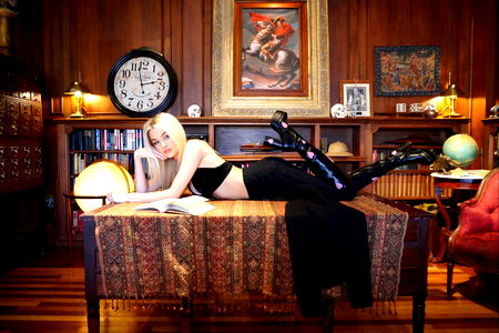 Lily, a prominent OnlyFans model, is seen holding an open book and standing in front of a library backdrop. She is known for her fashionable style and captivating charm.