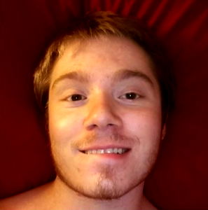 A young adult male with a beard and blonde hair is lying down, smiling broadly. He appears to be in his early twenties, possibly enjoying a comfortable moment at home.