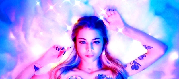 A captivating OnlyFans model, LittleLadyLacy, exudes confidence in a photoshoot set against the backdrop of neon lights and fluffy clouds. The image showcases her striking appearance with tattoos, body piercings, and an outfit that accentuates her unique style.