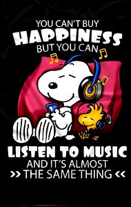 This image features a poster with a cartoon of a dog, reminiscent of the iconic character Snoopy from the Peanuts comic strip. The dog is shown wearing headphones and surrounded by images of music notes, symbolizing a love for music. The background of the poster is black, which contrasts with the white color of the dog's fur. The text on the poster conveys a positive message about happiness and the enjoyment of listening to music, making it an ideal piece for those who appreciate both the Peanuts character and music. The author, LilithLBrown, is from Lewiston, Idaho, and has chosen this image as their favorite model photo.