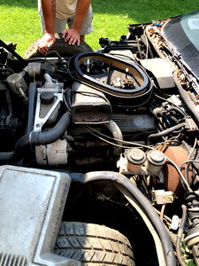 The image shows the front of an older model vehicle with its hood open. A person is standing behind the car, slightly to one side. The individual appears to be inspecting or working on the engine.
