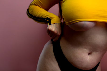 This image captures a young woman in her early twenties posing during a high-fashion photo shoot. She is dressed in stylish undergarments, showcasing her toned abdomen and waist. The top is a delicately designed brassiere that closely resembles a lingerie top with intricate detailing. The lower garment is equally tasteful, highlighting her slim thighs. The model's flawless skin radiates under the photo shoot lights, reflecting a healthy glow. Her shoulders and elbows are bare, subtly emphasizing her feminine joints and structure. The model's face is framed beautifully in the shot. Her facial features are expressive and youthful, adding to the overall elegance of the picture. She carries a certain charm and grace that is often associated with fashion models and art models. The picture is also a testament to her fitness, as seen in her well-toned stomach and chest. The image is tastefully provocative, bordering on a mild fetish model aesthetic. A hint of a fashion accessory can be seen, adding a touch of sophistication to her ensemble. This photograph is a perfect blend of high fashion, allure, and elegance.