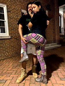 An image of two young individuals embracing each other in a celebratory manner, set against the backdrop of an outdoor setting. The individual on the left is wearing a black shirt and a cap, while the one on the right is in colorful leggings and a white top with a graphic design. Both appear to be in high spirits.