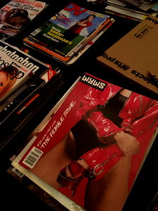 An OnlyFans model, LoveAndrew, is prominently featured in a magazine. The cover of the magazine is displayed alongside other magazines and books that share similar themes or genres. The presence of the model and the context of the scene suggest an adult-themed publication. The magazine is being showcased among various media, indicating the prevalence of such content.