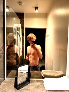 In this image, LS๐ is seen taking a selfie in a private bathroom. He is shirtless and has tattoos on his arms. The bathroom appears clean and well-maintained, with a mirror and countertop visible. 25 years old, Male.