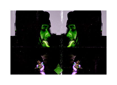 This image is a playful fusion of popular culture elements with an extraterrestrial theme. The art style features a colorful background that resembles the cosmos with multiple aliens and characters from movies and music. In the center, there's a person with striking hair and makeup, embodying a sense of whimsy and creativity. The bottom right corner showcases a humorous take on an alien's takeover of a classic 'We Love Aliens' shirt. This artwork is rich in detail and invokes a sense of nostalgia for pop culture enthusiasts.