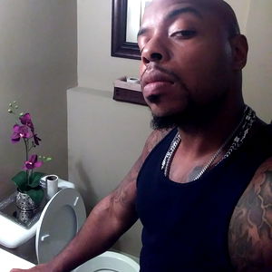 The image shows an African American man with a beard and tattoos. He is wearing a sleeveless black tank top, and his attire suggests a casual or athletic style. The individual has one visible tattoo on the arm, which may indicate personal interests or affiliations. The setting appears to be a domestic bathroom environment, as indicated by the presence of a toilet and a potted plant. His gaze is directed towards the camera with a neutral expression.