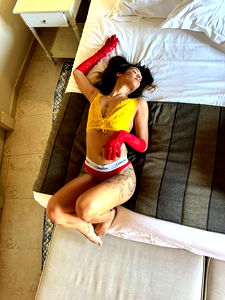 LucyMars, a popular OnlyFans model, is seen lounging seductively on the bed in her hotel room. She's dressed in a vibrant yellow bra and red panties, accentuating her sultry pose.