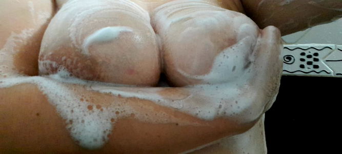 An OnlyFans model is captured in a candid moment, surrounded by bubbles. The individual appears to be in their mid-20s and is of female gender. Their physique suggests they are comfortable with their own body and enjoy self-care routines.