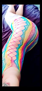 A young woman exudes confidence and vibrancy in a bold, multi-colored outfit. She stands in front of a mirror, capturing her pose with a phone camera. A hint of a tattoo peeks from behind a playful fishnet pattern. The image conveys an air of fun and flair, typical of OnlyFans content.