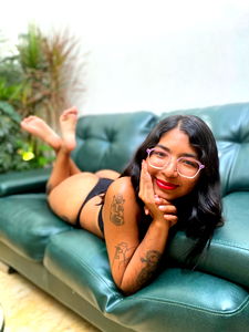 This image captures a youthful woman of approximately 27 years old, radiating a warm smile that lights up her face. She has a pair of glasses perched delicately on her nose, adding an intellectual charm to her overall appearance. She is lying down comfortably on a couch, embodying an aura of leisure and relaxation. The woman's clothes hint towards a slightly intimate setting. She is wearing what appears to be lingerie, adding a touch of femininity and sensuality to the scene. Her position on the couch accentuates her physical features, with her legs, chest, and arms visible in the shot. The indoor location further enhances the comfortable, homey atmosphere of the image. The couch, a significant piece of furniture in the frame, provides a cozy backdrop against the woman's relaxed posture. Its presence gives a sense of comfort and ease, making the viewer feel as if they are part of a casual, laid-back moment in the woman's day. Overall, the image portrays a scene of comfortable relaxation, with a touch of playful femininity and intellectual charm.