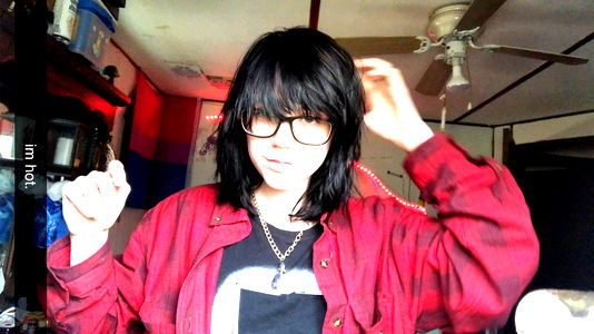 In the image, there is a young individual with short hair, sporting a blue top and sunglasses. They are sitting in a car, captured from the backseat. The person is looking towards the camera, exuding a casual yet stylish vibe.