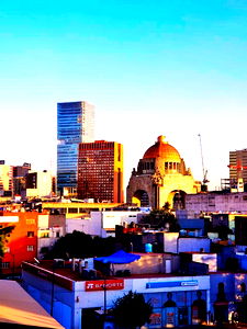 A breathtaking view of a bustling city during sunrise. The image captures the unique blend of historical architecture with modern skyscrapers, all under a clear blue sky.