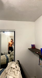 A young adult man takes a selfie in front of the mirror, showcasing his fitness and confidence. The room appears to be a simple living space with minimal decor.