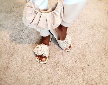 A home pedicure with a vibrant blue nail polish, done in the comfort of one's own space. The feet are beautifully manicured, displaying a white and blue flip flop style. 18+ content.