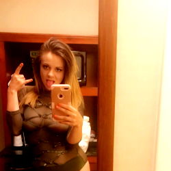 In the image, a young adult model is captured in a candid moment while in a dressing room. She appears to be engaged in her work as she takes a selfie with her phone. She is dressed in a lingerie-style outfit and is seen holding a hair drier. The background suggests that she might be preparing for a photo shoot or an event. The overall atmosphere of the image is casual and relaxed.