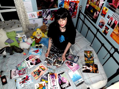 A striking image of a model, Madison, from London. She exudes confidence and style in her black outfit and cat ears. Her unique blend of punk and gothic aesthetics is reflected in the vibrant room behind her.