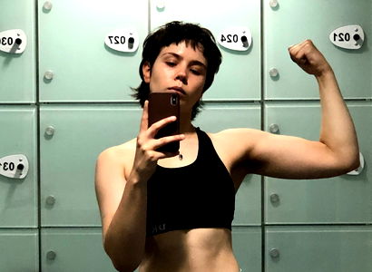 In the image, there is an individual posing for a photo. The person appears to be indoors and is wearing a sports-style outfit with a sleeveless top. They are holding a phone up to their face to take a selfie. The person has short hair and seems to be of young adult age.