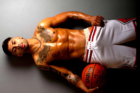 This image portrays a muscular and toned young man, likely in his late twenties. He showcases an impressively built physique, with a focus on his broad, well-defined chest and muscular abdomen. His toned stomach, complete with a visible navel, suggests regular bodybuilding activities. The man is barechested and shirtless, revealing a notable tattoo adorning his flesh. The intricacies of the design are not entirely discernible, but it adds a layer of intrigue to his overall appearance. His attire is minimal, wearing only a pair of briefs that might be classified as underpants or underwear. He's a bodybuilder, and his body is a testament to his dedication to fitness and bodybuilding. The strong line of his neck, the defined curve of his elbows, and the solidity of his joints all speak volumes about his physical strength and endurance. The image is highly detailed, capturing the striations in his muscles, the texture of his skin, and even the subtle shadowing around his features. The man's facial expression is not entirely visible, adding an air of mystery to the image. It's an image that exudes strength, dedication, and a certain raw masculinity.