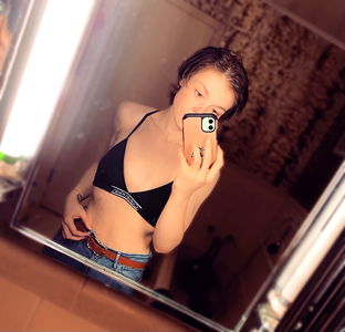 In the image, Mairead is seen standing in front of a large vanity mirror in a bathroom. She is wearing a black bikini top and has short hair. Her left hand is holding her cell phone, which she's using to capture this intimate moment.