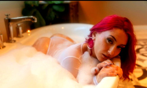 Lingerie model Mandy Muse in a steamy bathroom setting. She is laying on a bathtub with a soft pink glow surrounding her.
