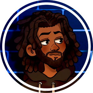 This image features an animated male character with a beard, sporting a casual style. He is set against a background with brick walls, suggesting an urban setting. His gaze is directed off to the side, giving him an intriguing and contemplative expression.