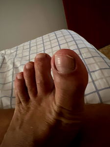 A close-up image of a foot with an unusual appearance, specifically regarding the toe nails, suggesting potential grooming or health concern. The person is not wearing shoes, and the background indicates a room with simple furnishings.