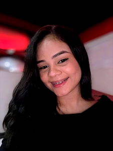 A young woman with a warm smile and long dark hair. She is wearing a black top and has her hair down. Her expression is friendly and approachable. She seems to be in an indoor setting, possibly a home or a public area.