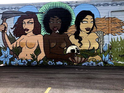 Street art mural featuring a vibrant scene of three female characters, each distinct in appearance. Artwork is rich in color and depicts themes of diversity and empowerment. Located on the side of a building, this piece adds a lively touch to urban landscape.