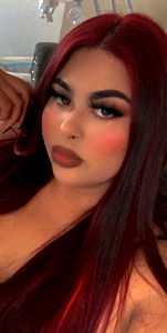 An OnlyFans model with striking red hair and a confident pose. Her makeup is impeccable, with dramatic eyeshadow and bold lipstick, adding to her alluring appearance.