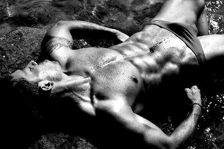 A black and white photograph of an OnlyFans model named Mark NYC, showcasing his muscular physique in a shirtless pose. The model is captured from a frontal angle, highlighting the definition of his abdominal muscles and the toned state of his body. This image could be associated with fitness, bodybuilding or modeling content.