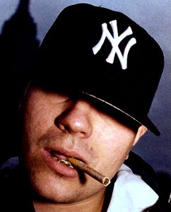 A photo of the rapper MastaDebater standing on a bustling city street, holding a cigar and smoking. He is wearing a black baseball cap with the letter 'Y' on it, suggesting he might be a fan of the Yankees. The backdrop of the Empire State Building hints that this photo was taken in New York City.