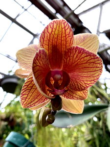A stunning orchid flower with red and yellow hues, elegantly displayed within the greenhouse. The plant is blooming, showcasing its full beauty.