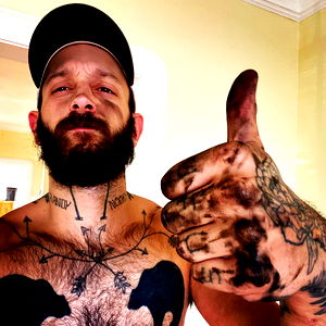 In the photo, Matt Muck is shown giving a thumbs-up sign. He has an array of tattoos on his arms and hands, and he sports a beard. The background suggests an indoor setting with a wall and a light fixture visible. His attire includes a baseball cap and what appears to be ink stains on his clothes, hinting at his profession or passion for art.