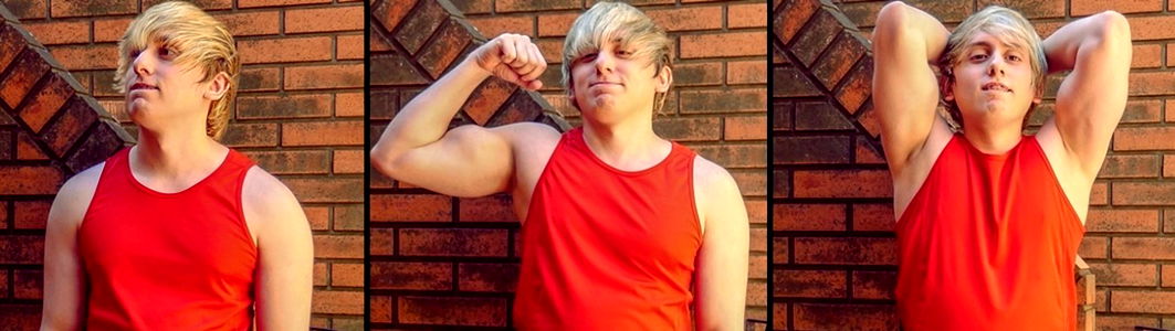 A person with blond hair, radiant eyes, and a sports jersey. He appears surprised or amazed.