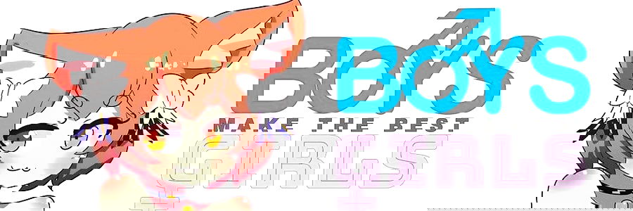 This is a playful image featuring an anime-style character, MawyBoi, with the text 'Boys Make the Best Girls' in the background. The character appears to be a young female with short hair and a content expression. She is wearing a blue outfit with a white collar and has what seems to be cat ears on her head. In the lower left corner of the image, there's a watermark that says 'Onlyfans'. The artwork captures a light-hearted and cute vibe.